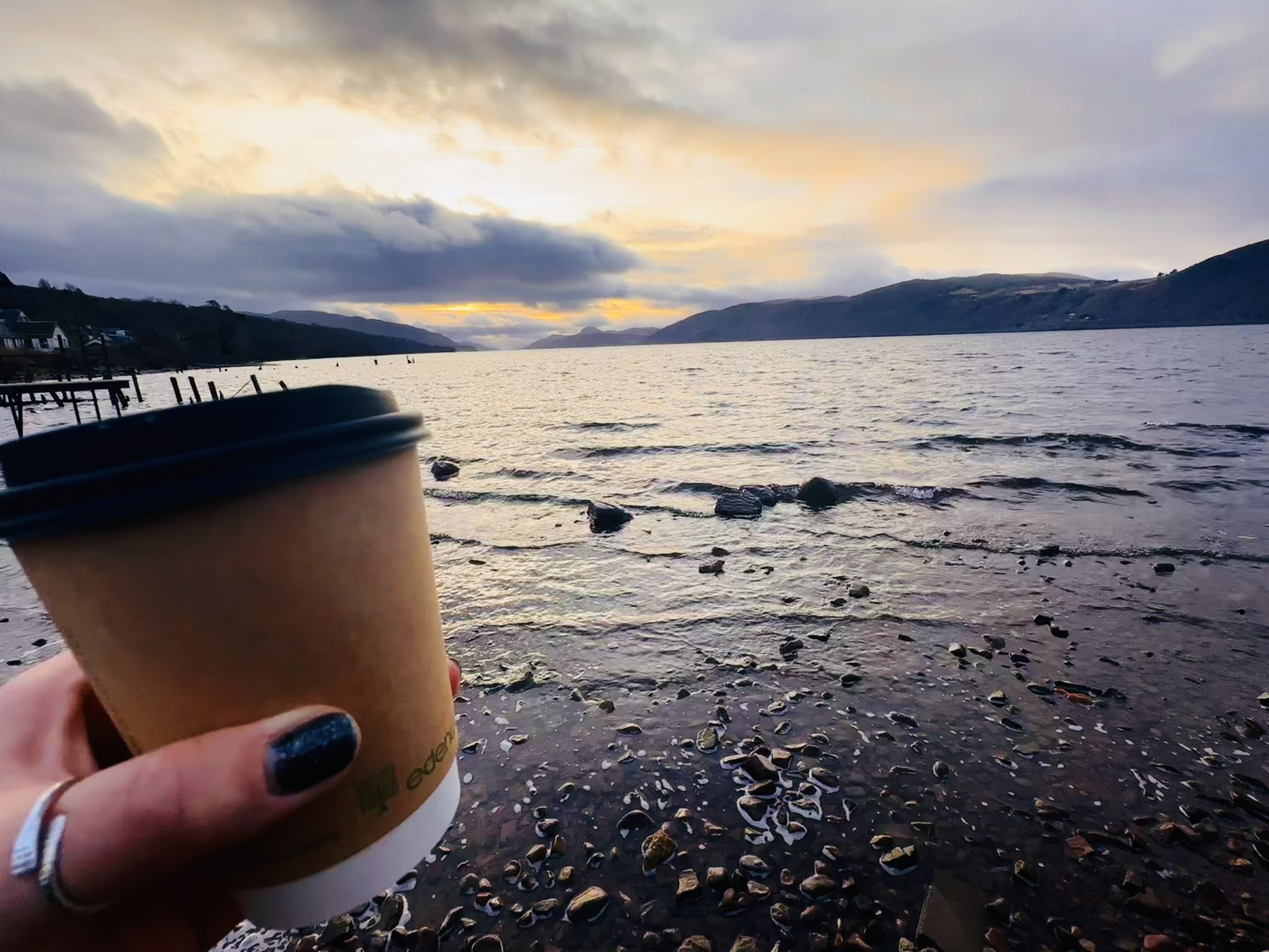 Solo wander this afternoon at Dores Beach and Torr Woods, just under 4 miles, treated myself to a hot chocolate from the spotty van and caught a glimpse of sunset. The weather soon changed and the views were gone with rain on the return.